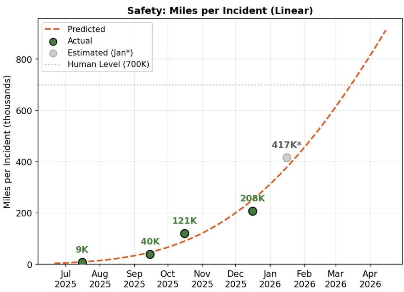 Sawyer Merritt tweeted that, saying “@raines1220, who has a PhD in Computer Science, predicts Tesla’s Robotaxi fleet in Austin will fully surpass human drivers by the end of Q1 2026.” If it’s enough to believe someone who has a PhD in Computer Science then I’m qualified to tell you that the chart above is full of errors and the dotted line is wishful thinking. But, again, the real story is we can’t infer much from any of this data. The error bars are miles high. But my prediction is that the end of Q1 will not see a big improvement in Tesla’s miles-per-incident. Certainly nothing close to Waymo’s.