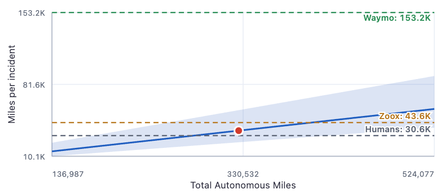 Note also that all these numbers are pessimistic because we’re only counting paid miles, but the incident database includes testing and so-called deadhead miles, where the robotaxi is empty in between fares. But since that’s consistent across companies, the comparisons should be fair.