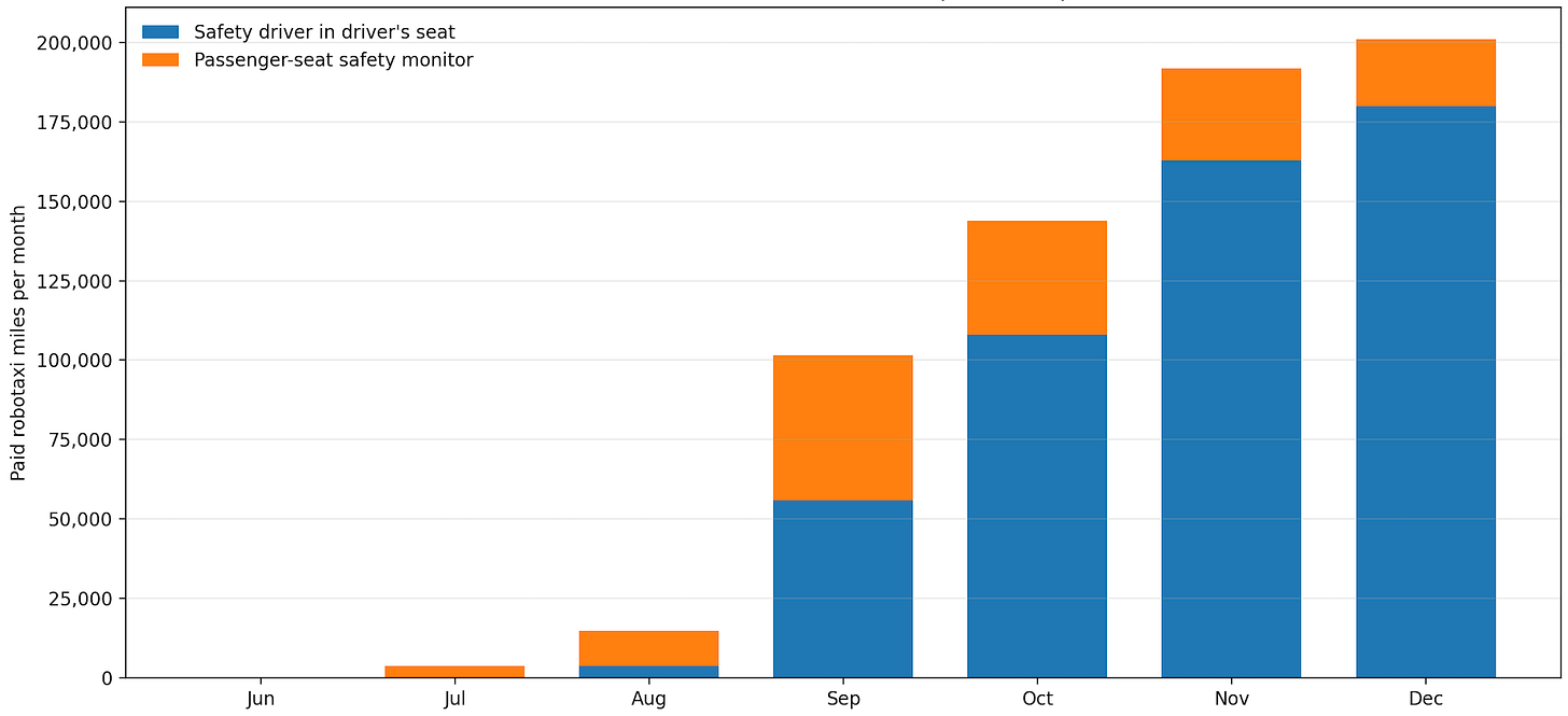 The sum of the orange bars (interpolating for December so we end when the NHTSA data ends on December 15) is 135,562 miles. Or we could trust the crowdsourced Robotaxi Tracker which infers that Tesla robotaxis have accumulated 456,099 miles in Austin. We still need to remove miles in which the robotaxi had a safety driver in the driver’s seat. A lot of guessing is required. Here’s my conclusion: