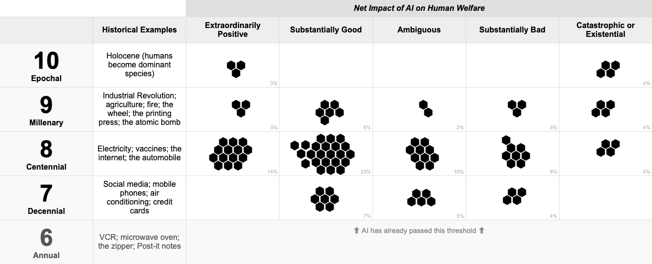 It’s been one full year since I wrote about AI Risk and the Technological Richter Scale. I think it holds up? My probability of AI plateauing at a level where it’s merely the most important tech of the decade (“7-Decennial”) has gone way down. But also my probability of “10-Epochal”, where artificial superintelligence is to humans as humans are to animals has gone down. But only because the 3.9 years remaining till 2030 feels too short for that to play out. I see it as a potential outcome on the table in any case. I now put it at 80%+ probability that we hit “8-Centennial” (with electricity, vaccines, the internet, the automobile) or higher this decade. Maybe something intermediate between 7 and 8 deserves a fair bit of probability mass. If I use my Tech Richter Scale tool today, here’s where I’m at: