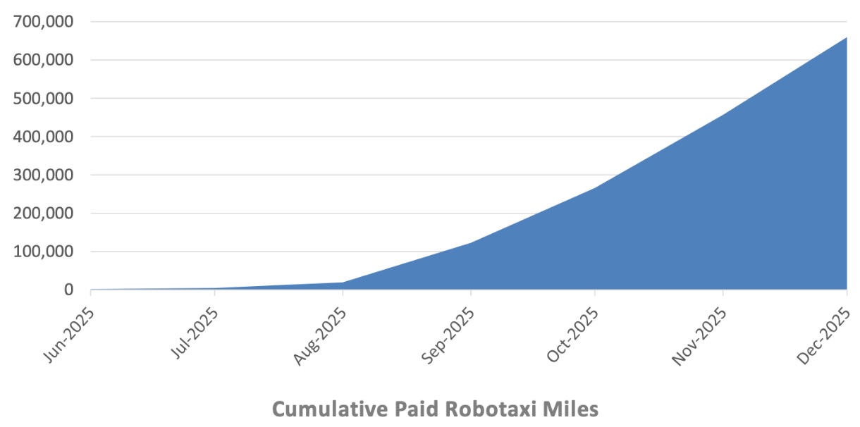 But that (disingenuously, I’d argue) lumps together San Francisco Bay Area miles, which are supervised, with Austin miles, which, giving Tesla a lot of undeserved benefit of the doubt, are unsupervised. Apparently Tesla has 500 robotaxis across the Bay Area and Austin and 50 in Austin. Naively, that means 90% of the robotaxi miles Tesla’s touting are normal Uber-style trips with the driver using FSD (possibly with impressively low disengagement rates but as far as I know Tesla isn’t sharing that data). If I try to get the robominions to make a mileage graph that incorporates all that, we get this: