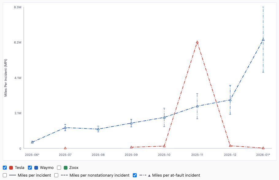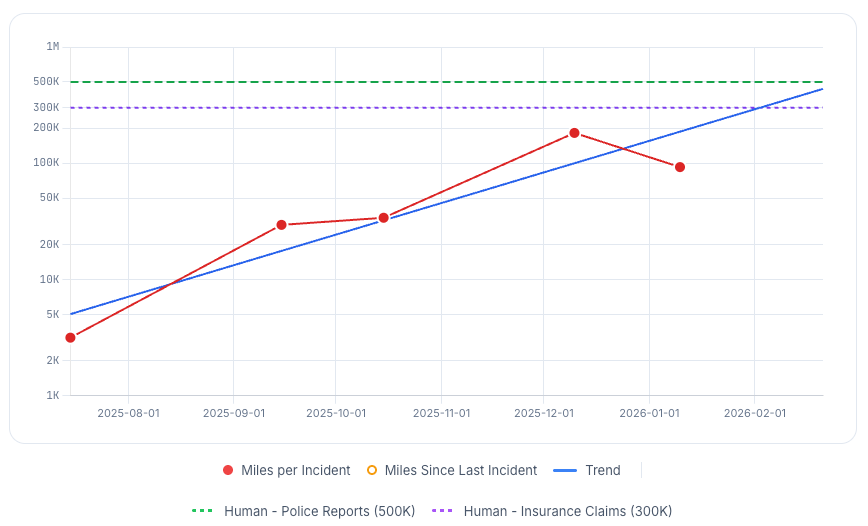 Sawyer Merritt tweeted that, saying “@raines1220, who has a PhD in Computer Science, predicts Tesla’s Robotaxi fleet in Austin will fully surpass human drivers by the end of Q1 2026.” If it’s enough to believe someone who has a PhD in Computer Science then I’m qualified to tell you that the chart above is full of errors and the dotted line is wishful thinking. But, again, the real story is we can’t infer much from any of this data. The error bars are miles high. But my prediction is that the end of Q1 will not see a big improvement in Tesla’s miles-per-incident. Certainly nothing close to Waymo’s.