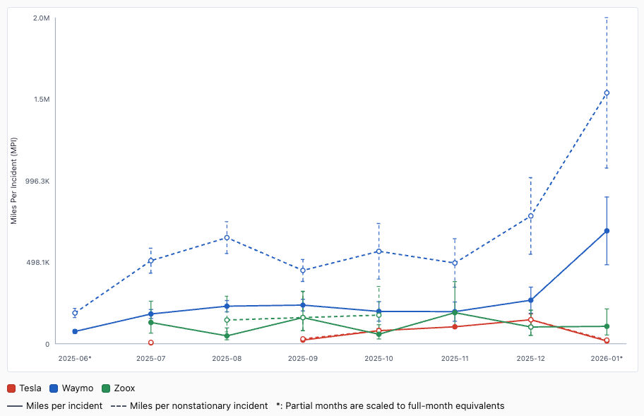 That’s Waymo in blue starting superhumanly safe (see discussion last week for why it’s wrong to treat humans as crashing only every 300k or 500k miles in this context) and shooting beyond a million miles per incident recently. Mostly the answer for both Tesla and Zoox is that we don’t have enough data to be sure of anything. Taking the data at face value, the number of miles a Tesla robotaxi can between crashes just fell off a cliff. Figuratively speaking; almost all of these incidents are at worst minor fender benders. So if you want to believe that Tesla is about to figure out vision-only self-driving for real, this shouldn’t really dissuade you.