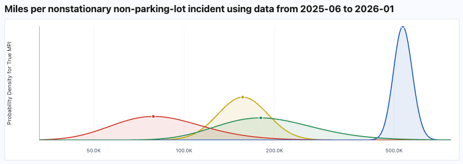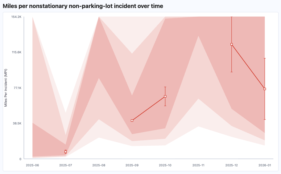 Anyway, the news this week is that the new NHTSA data came out and there was only one (1) additional robotaxi collision (hitting an object in the road or something; Tesla redacts the details of course, to maximize the ambiguity). So that sounds like an improvement! But simultaneously the mileage for the robotaxis — the ones subject to this reporting, that is — seems to have gone down (by how much? haha, we have no idea). In short, the error bars are still miles wide with no ability to tell if safety is improving: