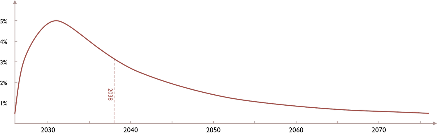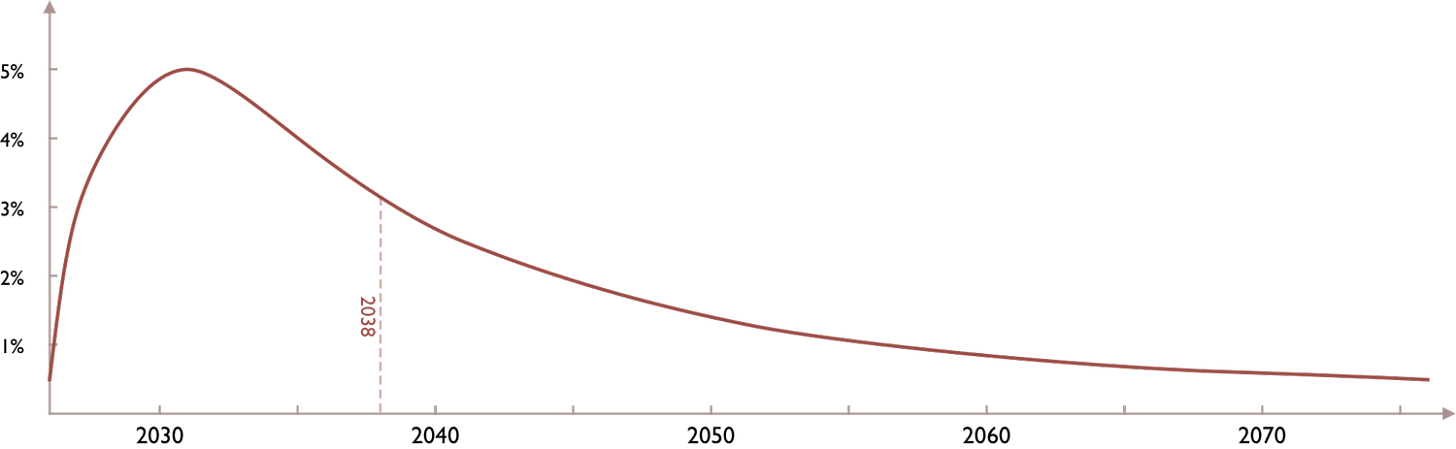 Speaking of deep uncertainty, I really like Toby Ord’s new essay published yesterday, “Broad Timelines”. Nothing too surprising for regular AGI Friday readers. The bottom line is that Ord’s probability distribution for when we hit transformative AI is this: