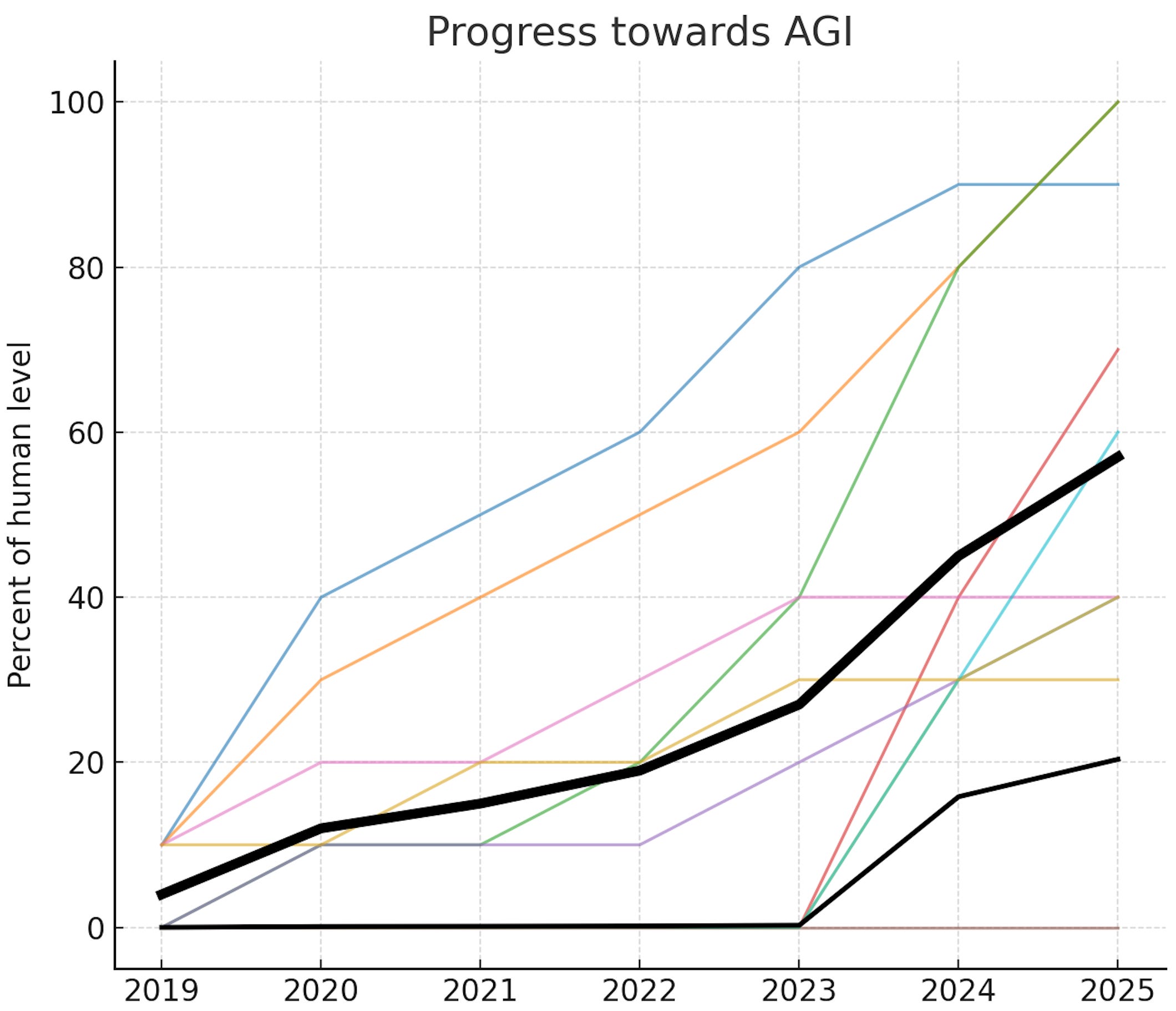 So that’s a nice snapshot but can we plot the progress over time and see where things seem to be heading? We can try! I had all my robot friends (ChatGPT, Claude, and Gemini) put their heads together to estimate the state-of-the-art scores for all 10 components for every year back to 2019. Their independent guesses were quite similar. I then showed each of them the others’ guesses and let them converge, which they were happy to do. I realize that’s still pretty dodgy, but rough estimates are good enough for our purposes. Here’s how it all looks: