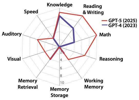 The authors assess GPT-4 and GPT-5 on each of those and come up with this visualization of how much closer to AGI we’ve gotten in the last two years: