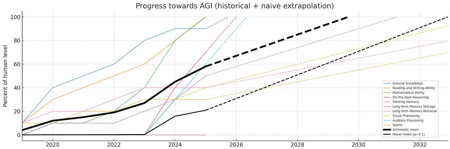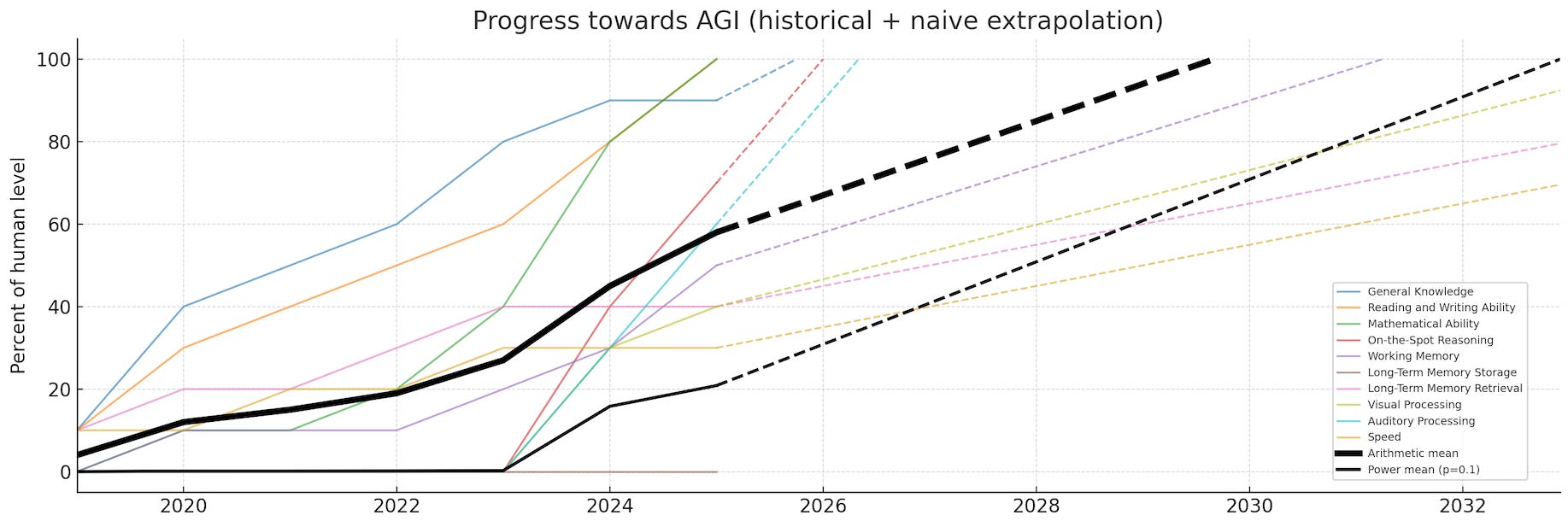 If we were maximally pessimistic, we’d take the minimum of all the components and call that the true fraction-of-AGI value. Which would mean we’re still at exactly 0% of the way to AGI overall. What if we’re only mostly pessimistic? There’s an elegant generalization of “average” known as the power mean where you have a parameter p that you can set to 1 for a standard arithmetic mean but can dial down to get closer and closer to the extreme where you count only the minimum. I arbitrarily picked p=0.1 and plotted that as the thinner black line (notice that that changes the AGI score in 2025 from 60% down to 20%). Here’s what we get if we naively extrapolate all these lines forward:
